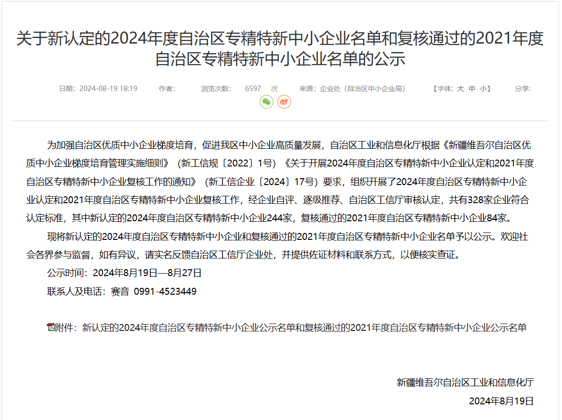 自治區工業和信息化廳根據《新疆維吾爾自治區優質中小企業梯度培育管理實施細則》(新工信規〔2022〕1號)《關于開展2024年度自治區專精特新中小企業認定和2021年度自治區專精特新中小企業復核工作的通知》(新工信企業〔2024〕17號)要求,經企業自評、逐級推薦、自治區工信廳審核認定,共有328家企業符合認定標準,其中新認定的2024年度自治區專精特新中小企業244家,復核通過的2021年度自治區專精特新中小企業84家。恒升醫學位列其中。
