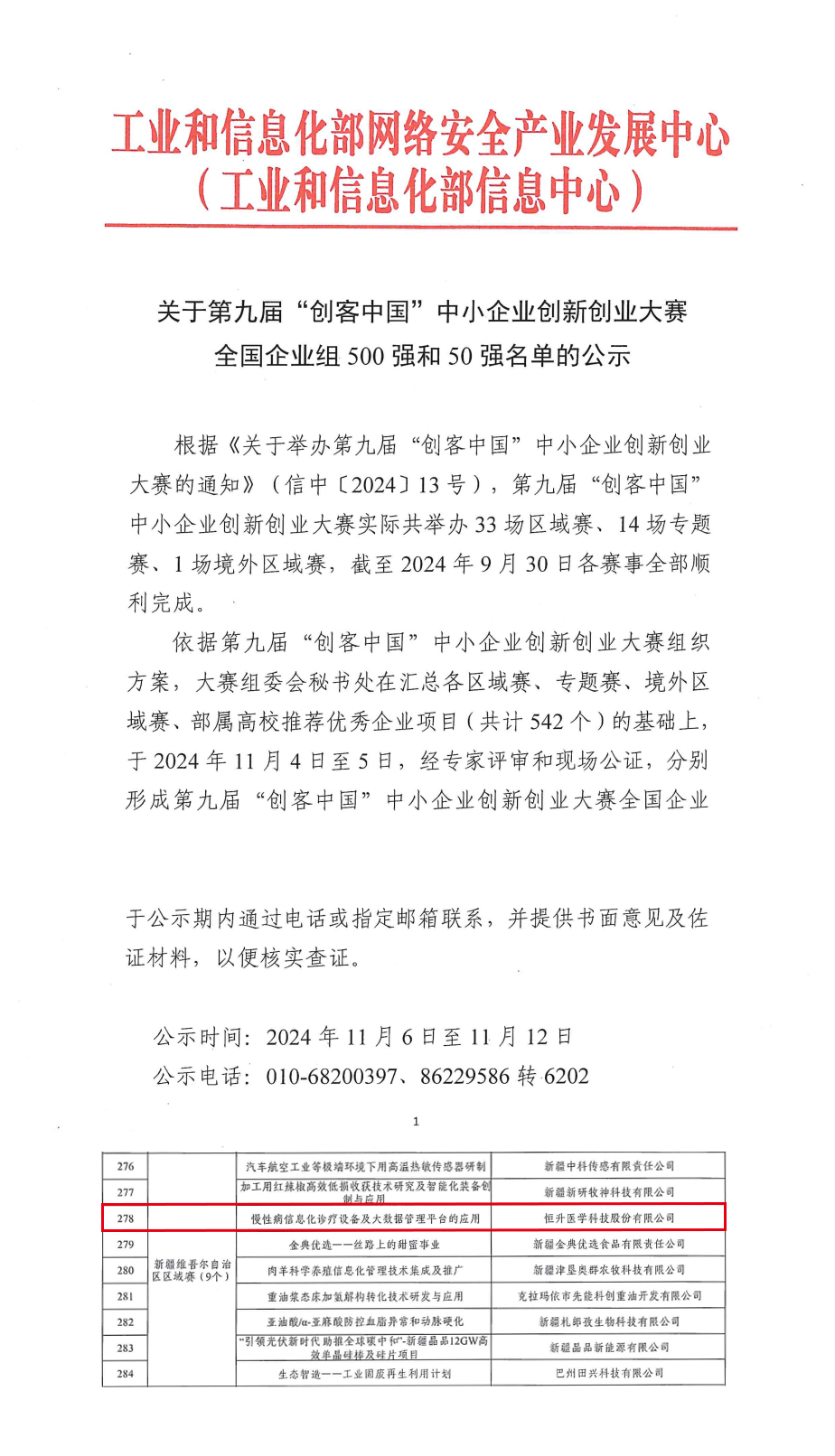 恒升醫學以烏魯木齊市選拔賽第一名的成績入圍新疆維吾爾自治區半決賽,經過激烈角逐后入圍新疆維吾爾自治區決賽,在決賽中取得企業組二等獎的好成績,入圍第九屆“創客中國”中小企業創新創業大賽全國企業組評選,并成功入選全國企業組500強。