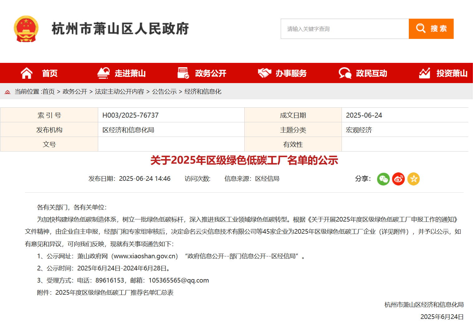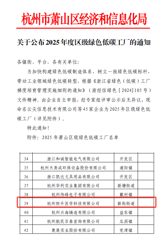 近日,杭州市蕭山區經濟和信息化局公布2025年度蕭山區級“綠色低碳工廠”認定名單,杭州恒升醫學科技有限公司憑借在綠色制造、節能減排、循環經濟等方面的突出表現,從眾多參評企業中脫穎而出,成為全區45家獲得“綠色低碳工廠”命名的企業之一。