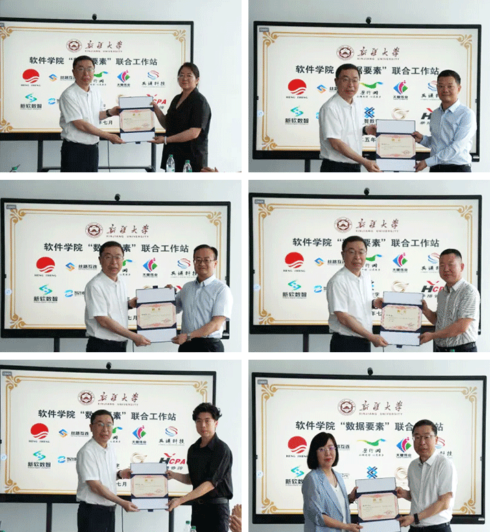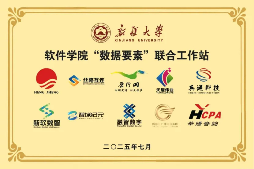 2025年7月11日來自新疆大學軟件學院、新疆原行網智慧文旅有限公司、新疆生產建設兵團通信科技中心有限公司、新疆絲路互連數字產業發展有限公司、新疆智域紀元科技有限公司、新疆融智數字經濟產業發展有限公司、烏魯木齊天耀偉業信息技術服務有限公司、恒升醫學科技股份有限公司、新疆新軟數智科技有限公司、天山農商銀行、新疆華陽有限責任會計師事務、新疆聚廣律師事務所等單位負責人,共同為新疆大學軟件學院“數據要素聯合工作站”成立揭牌。